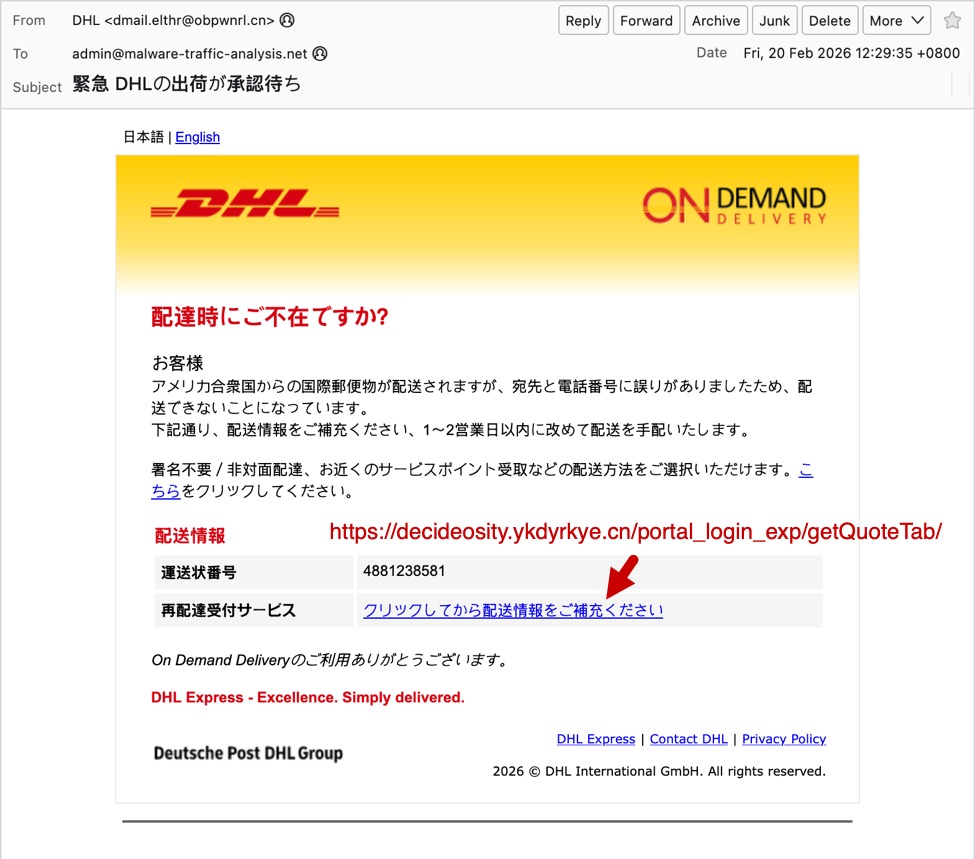 Shown above: Example of a Japanese phishing email impersonating DHL.