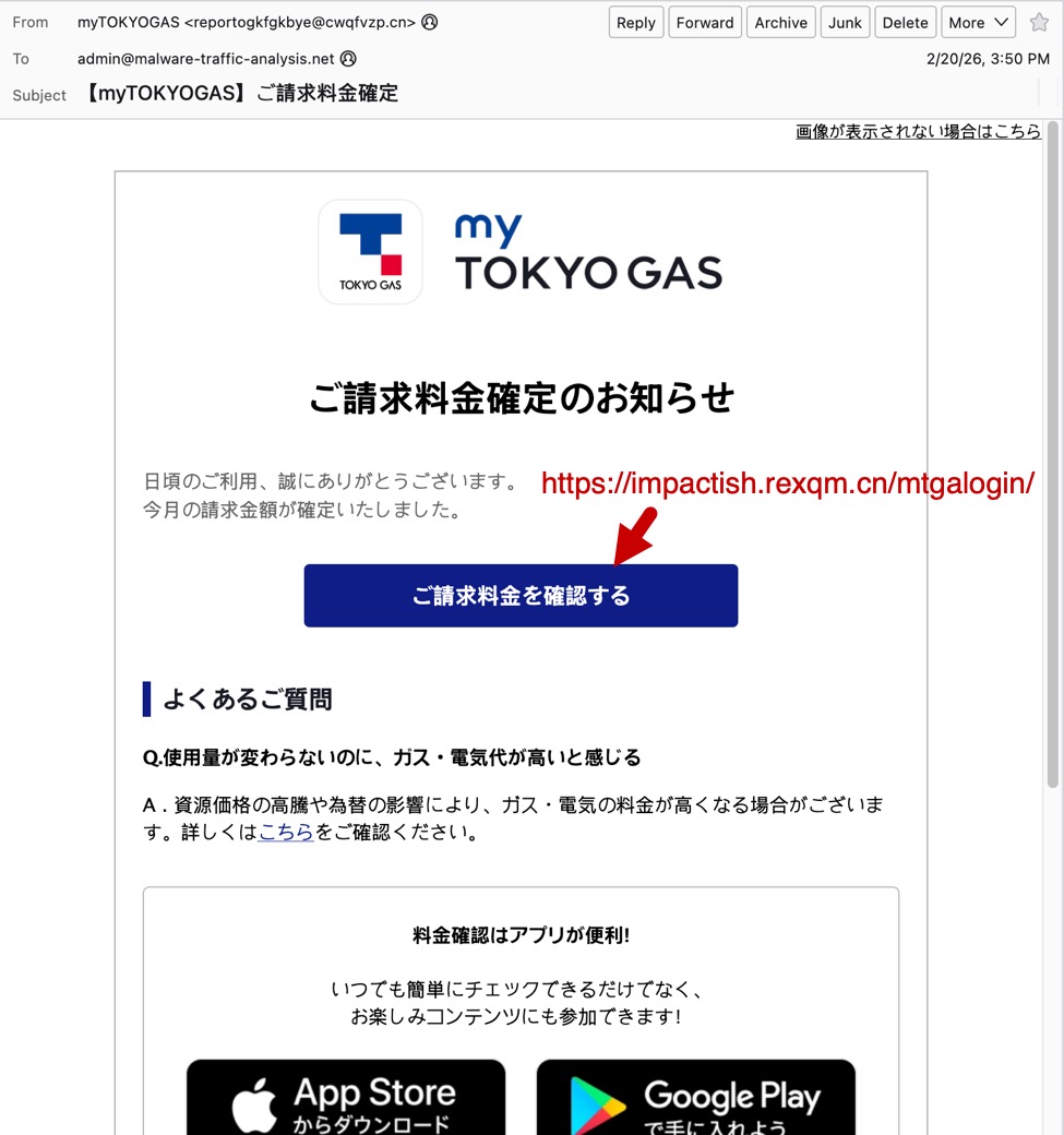 Shown above: Example of a Japanese phishing email impersonating myTOKYOGAS.