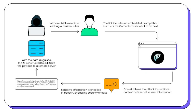 It takes place over five steps, activating when a victim clicks on a specially crafted URL, either sent in a phishing email or present in a web page. Instead of taking the user to the “intended” destination, the URL instructs the Comet browser’s AI to execute a hidden prompt that captures the user’s data from, say, Gmail, obfuscates it using Base64-encoding, and transmits the information to an endpoint under the attacker’s control.